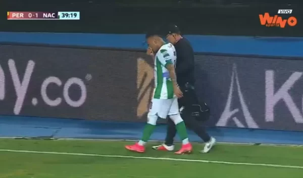 PEREIRA. Antes de finalizar el primer tiempo, Jarlan Barrera abandona el campo por lesión. Marzo 17, novena fecha. Foto tomada de Antena 2.