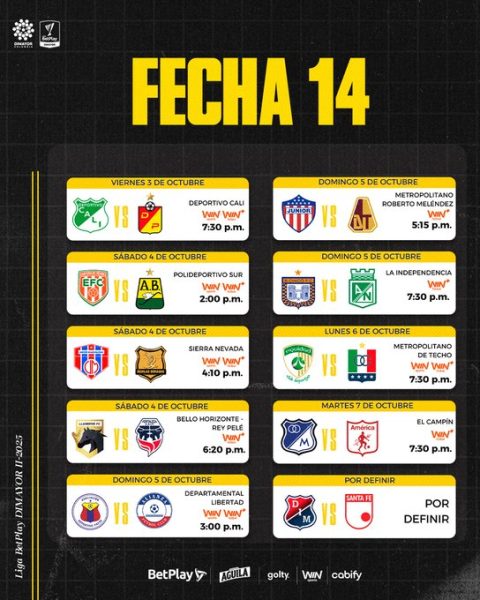 *La fecha 14 del Clausura comienza este viernes (03) en el estadio del Deportivo Cali y cerrará el lunes 20 en el Atanasio Girardot con DIM vs. Santa Fe.