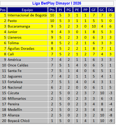 -En Bogotá. Anoche, estadio Olaya Herrera: Fortaleza 2 – Medellín 2. Goles: Hayen Palacios (27′), Nicolás Rodríguez (30′); Luis Sandoval (75′), Brayan León (86′). Cierre parcial de la 7a. fecha. Quedan pendientes dos cotejos.