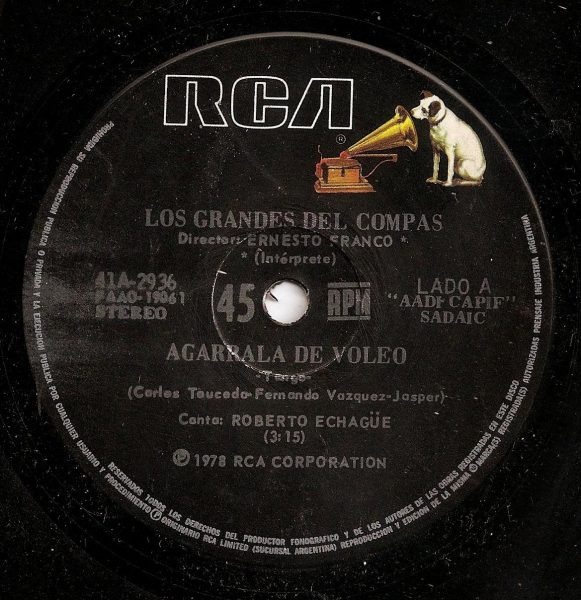 Agarrala de voleo. Tango. Letra: Fernando Vázquez y Carlos Touceda. Música Raúl Garello. Grabado por Roberto Echagüe con el acompañamiento de la orquesta de Ernesto Franco.