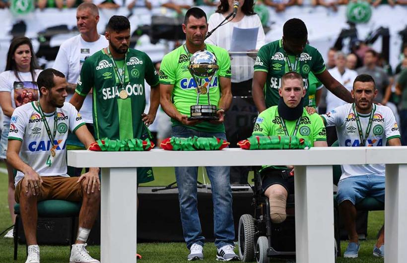 Los tres jugadores del Chapecoense que sobrevivieron al accidente aéreo que diezmó al equipo en noviembre pasado alzaron…