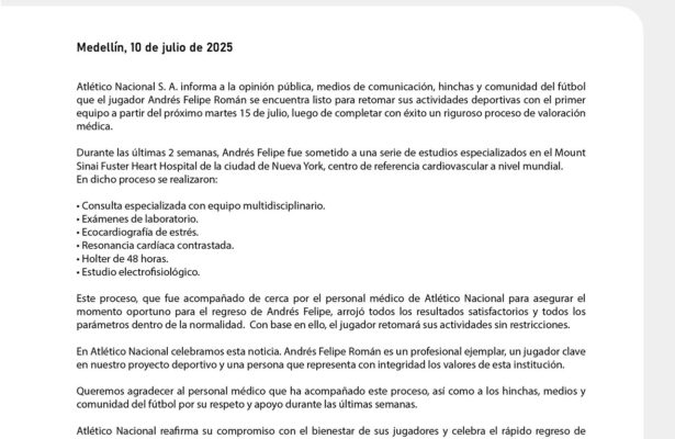 *Atlético Nacional informó de manera oficial el estado de salud de Andrés Felipe Román, lateral por derecha que ha sido…