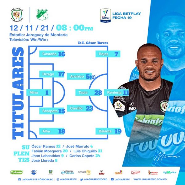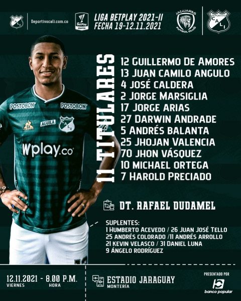 Este es el onceno titular de Deportivo Cali, para enfrentar a Jaguares por la jornada 19 de la #LigaDimayor.
