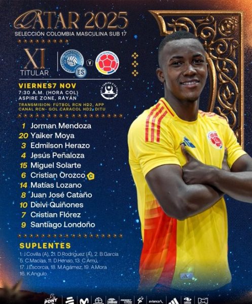 🚨 𝗧𝗜𝗧𝗨𝗟𝗔𝗥 – Así formará nuestra Selección Colombia Sub 17 para enfrentar a 🇸🇻 El Salvador en su segundo partido por la Copa Mundial de la FIFA.