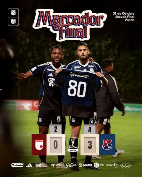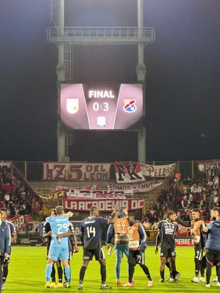 BOGOTÁ, Abrazos de la clasificación a semifinales de Copa. DIM le dio vuelta a la serie, superó nítidamente a Santa Fe. El marcador lo dice todo. Foto @DIM_Oficial.
