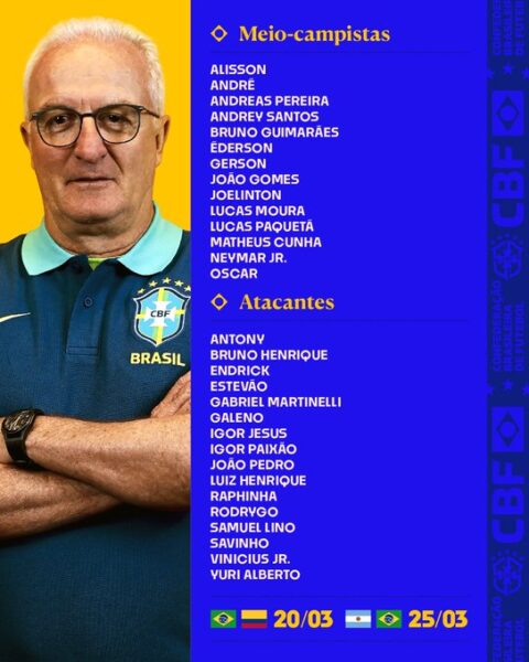 El entrenador Dorival Júnior seleccionó 52 atletas. La próxima semana, el técnico anunciará los 23 jugadores convocados en un acto en Río. Brasil se enfrentará a Colombia el 20 en Brasilia y a Argentina el 25 en Buenos Aires.